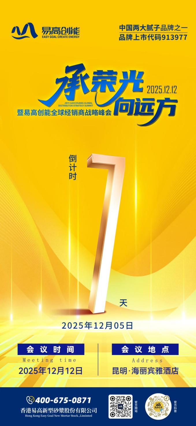 12 月 12 日,“承荣光・向远方” 暨 2025 易高创能全球经销商战略峰会将在中国·昆明如期而至。无论是聚焦长远的五年计划、引领行业的技术突破,还是赋能终端的门店升级,都彰显着易高好腻子 “与经销商共成长、与行业共发展” 的决心。期待在滇峰之上,与全球经销商相聚一堂,共话未来、共启新程,在健康家装的赛道上续写更多辉煌!